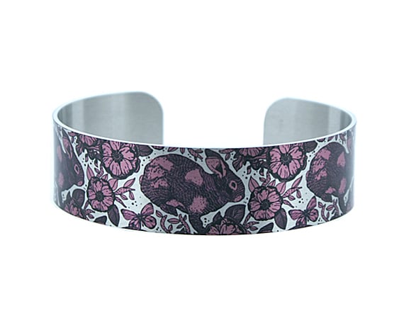 This is a narrow cuff bracelet in made from 90% recycled brushed silver aluminium with purple rabbits.