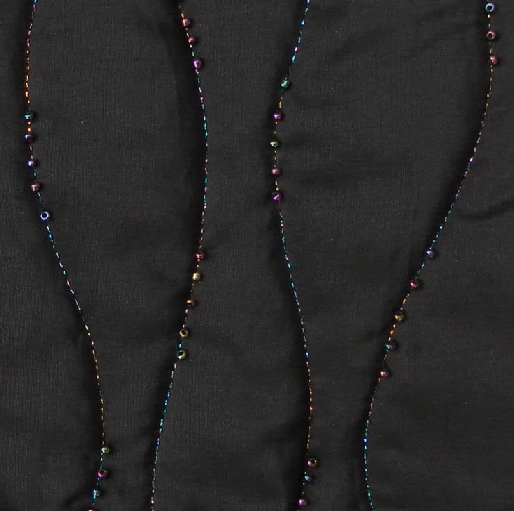 A beautiful and elegant, black satin clutch bag, with iridescent hand beaded detailing on the front flap. It is a one off and would be exclusive to you. The bag is quilted with iridescent metallic thread and lined with black china silk and has a generous internal slip pocket. There are two buttons on the inside of the flap which fasten into two silver tone rings, making a concealed fastening. There is a wrist strap which is light enough to be tucked inside the bag if you prefer not to use it. You could use it to clip your keys to. The bag measures approximately 26cm x 19.5cm and is ideal for teaming with that little black dress for a party or a night out!
