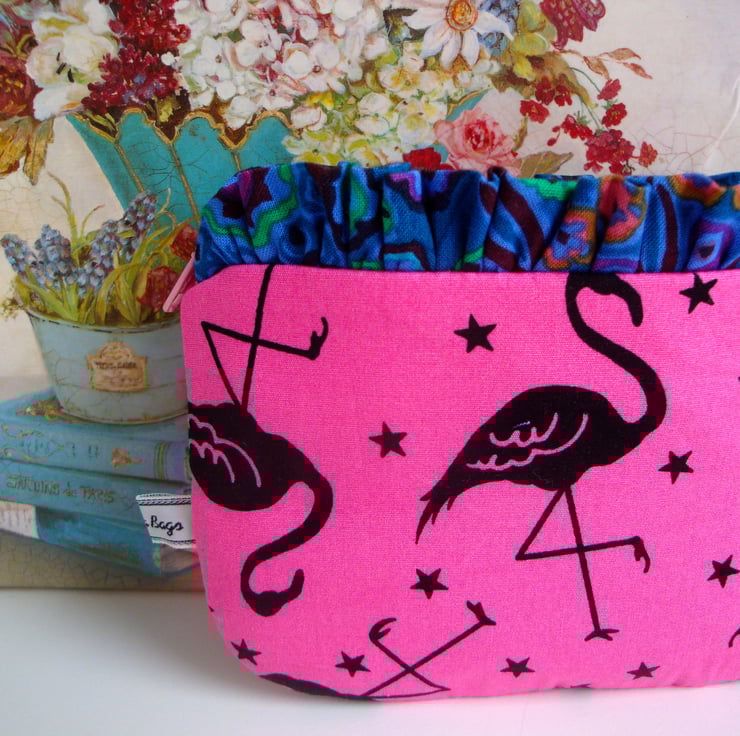 A lovely handmade coin purse / store cards / mini make up bag , made in a funky printed flamingo cotton fabric .