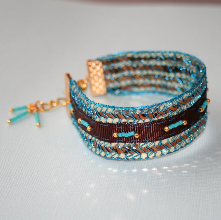 A beautiful turquoise, brown and silver sequinned ribbon from Mokshatrim has been embellished with brown grosgrain ribbon and turquoise and gold seed beads to make this wonderfully decadent cuff. It is finished with a gold plated clasp and a tassel made from the turquoise and gold seed beads.
