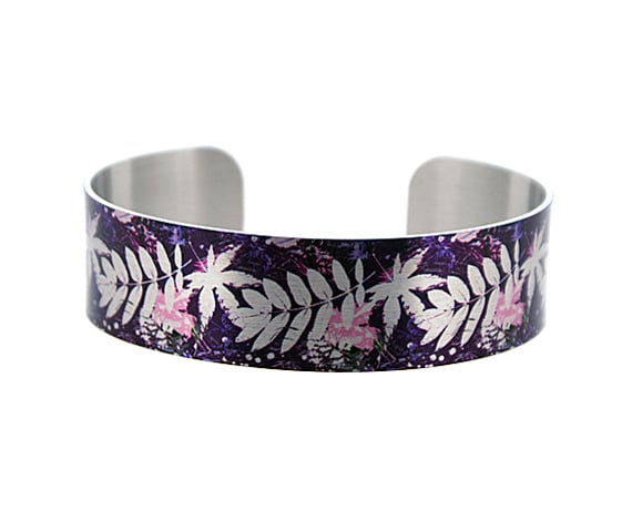 This is a narrow cuff bracelet in made from 90% recycled brushed silver aluminium with a purple background and silvery ferns and leaves, with a few touches of pink.