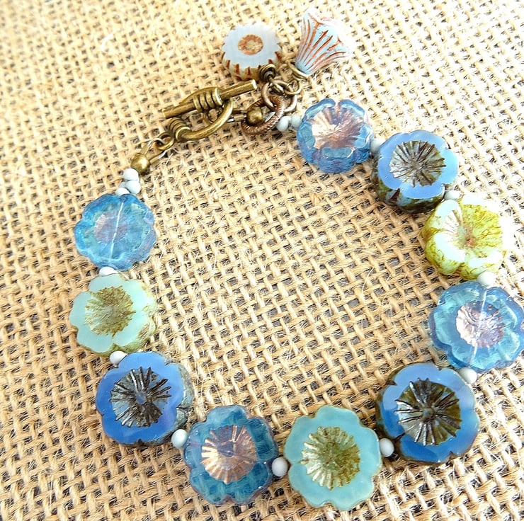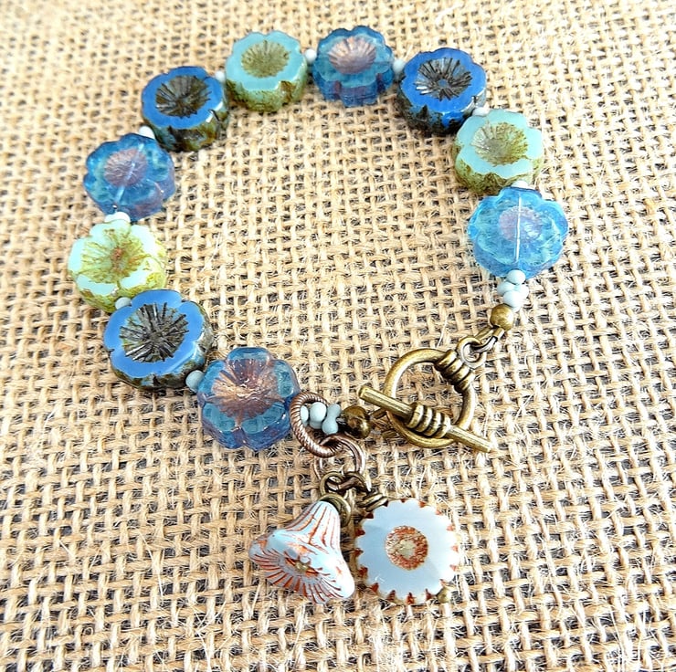 This is a lovely bracelet made entirely with high quality czech glass beads. These consist of 14mm czech flower beads in different shades of blue, these are interspersed with matt blue czech peanut beads. I have also added a czech glass daisy wheel and a czech bell flower which both hang as charms from the toggle. The bracelet measures 20cm (8") and closes witj a antique bronze colour toggle clasp. As all of the items in my shop are unique, individual pieces made by myself, this is the bracelet you will receive. It will arrive gift wrapped in tissue paper and a organza bag.