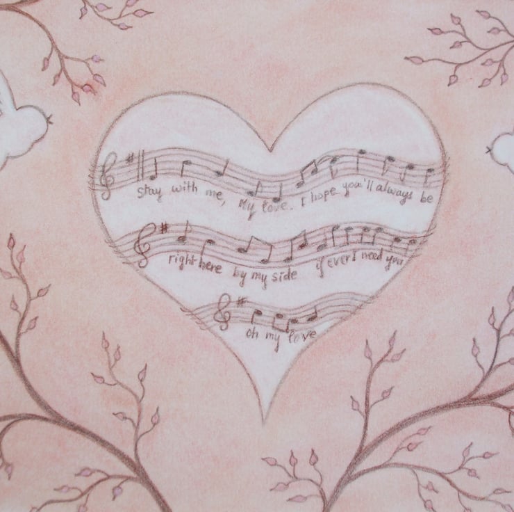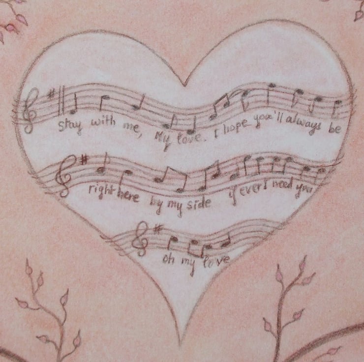 Music Card; Heart with music and birds. The words and music in the heart are from Genesis' song 'Follow Me Follow You':