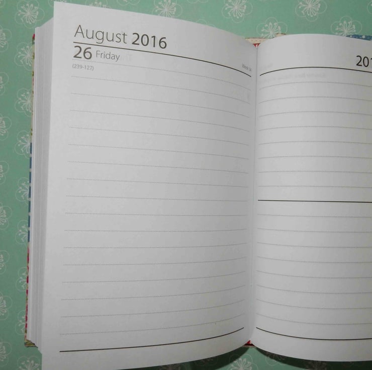 This is an A6 (approx. 6x4 inches) day to page, fabric covered diary. It is covered in a pretty patchwork effect fabric. Complete with standard day to page diary, refills are easily available, for the next year. The cover is lined, interfaced and removable.