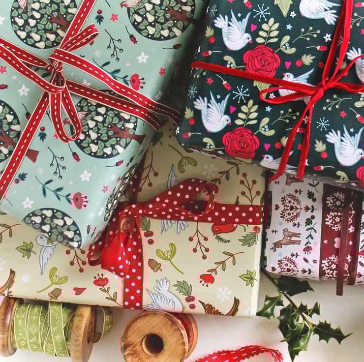 Gift wrap comes as folded flat sheets inside a protective cello sleeve.