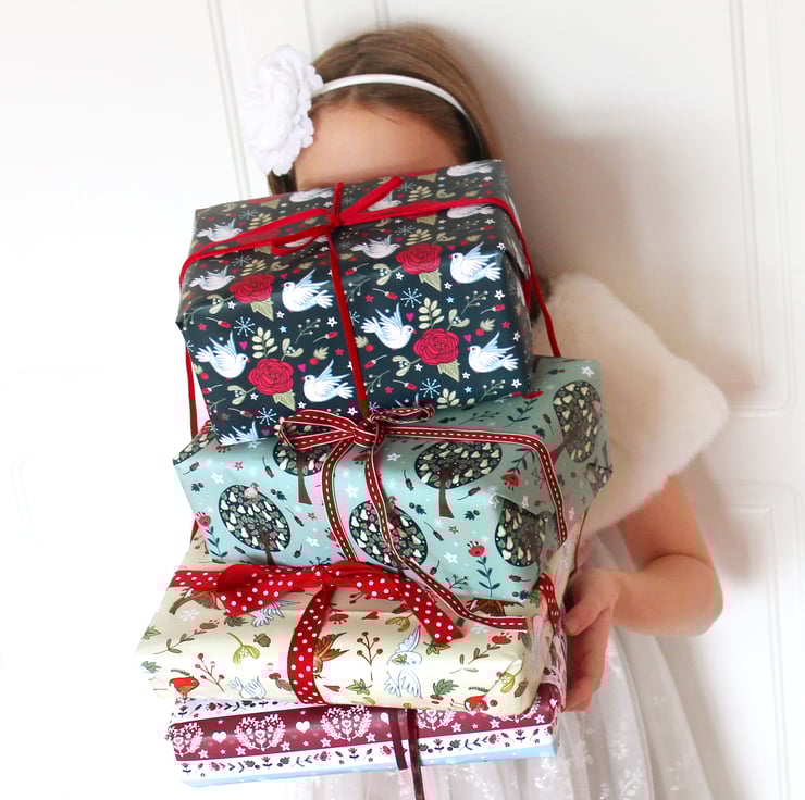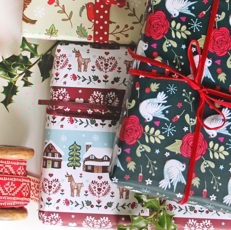 Gift wrap comes as folded flat sheets inside a protective cello sleeve.
