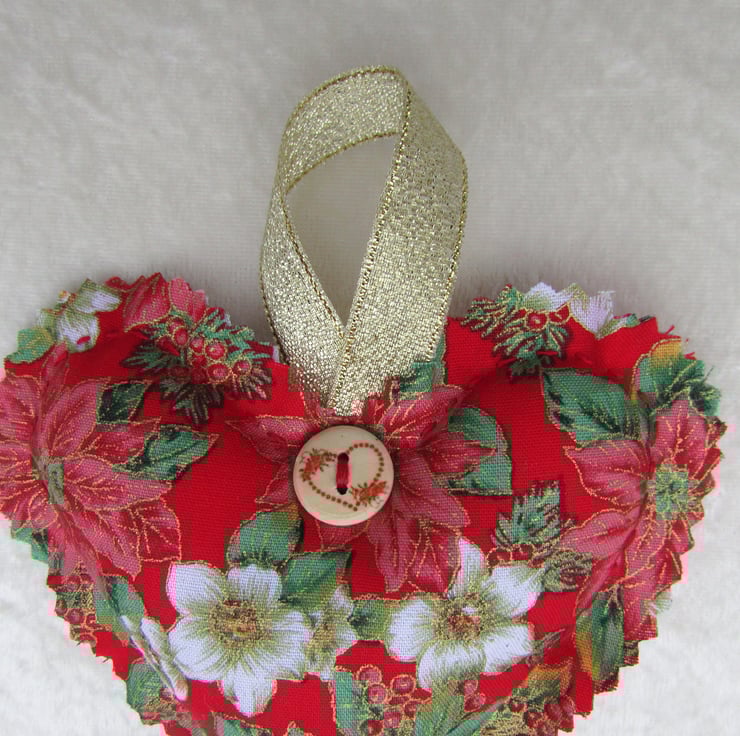 A padded Christmas decoration hanging heart made from a delightful red fabric with a pretty white, green, red and gold Christmas floral print pattern. The heart is hand-stitched and the edges are pinked to give a scalloped edge. It is embellished with a round wooden patterned button and has a gold sparkly hanging ribbon. Size approx. 4.5" (11.5cm) high (excluding ribbon) x 4.5" (11.5cm) wide. The decoration is filled with polyester hollow fibre filling which conforms to safety regulations.