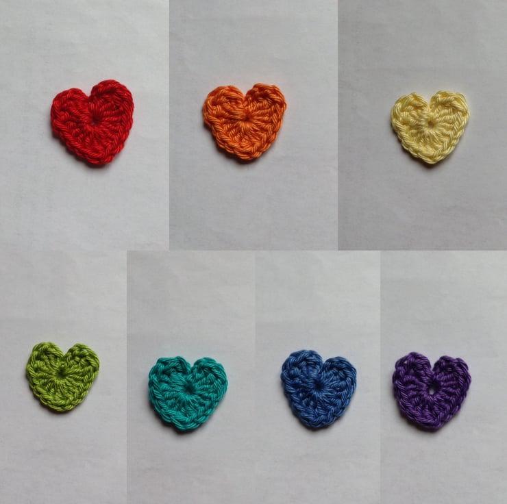 Set of seven crocheted small heart appliqués embellishments, one of each of the seven colours in the rainbow: red,orange,yellow,green,blue,indigo,violet.