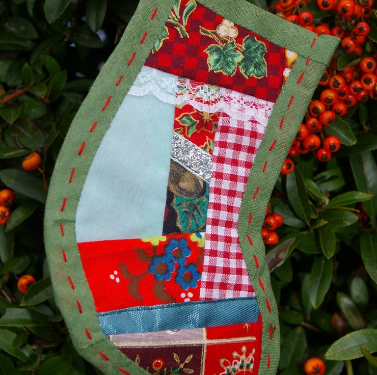 Three little Christmas stocking decorations lovingly created in crazy patchwork with added lace and ribbon. Each Christmas stocking decoration is different but all three have been created with Christmas themed poly cotton fabric’s and festive plain greens and with red and white and green and white checks.