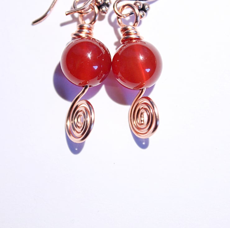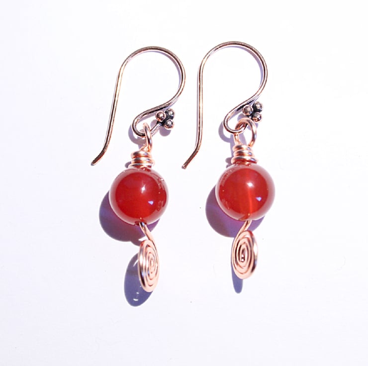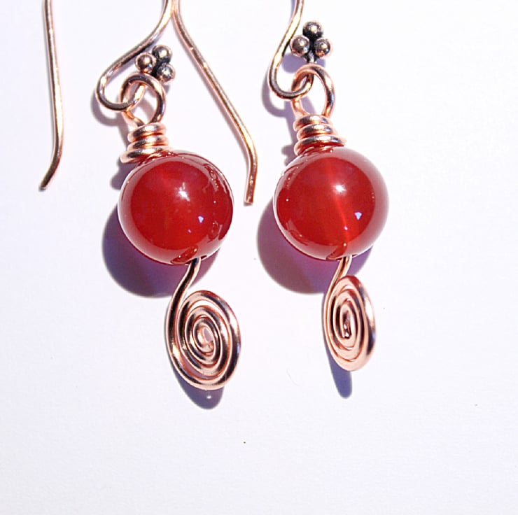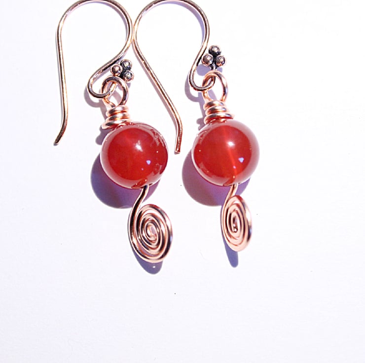 Lovely and simple carnelian and copper earrings. I made these from 10 mm beads of carnelian, wire wrapped to form a dangle with a tight wound spiral at the lower end.