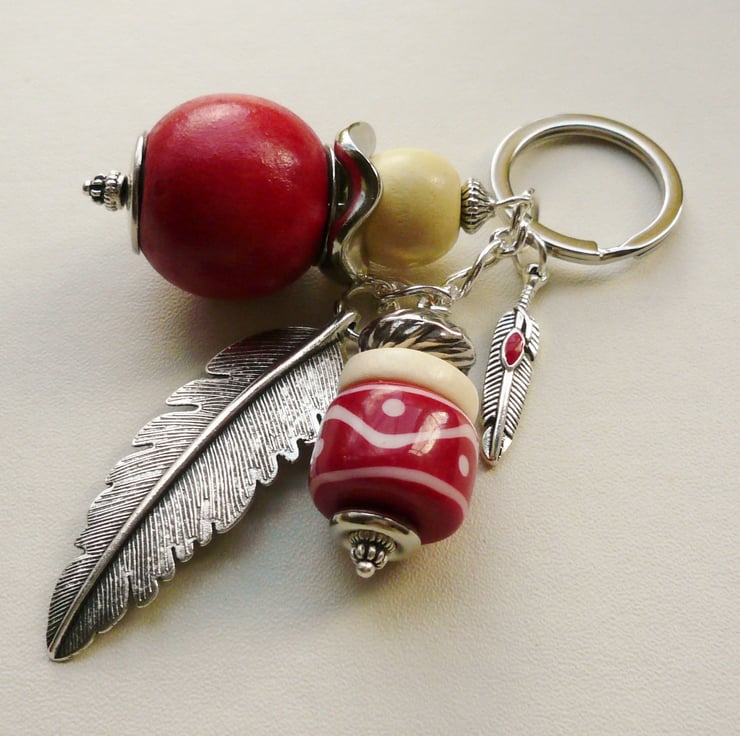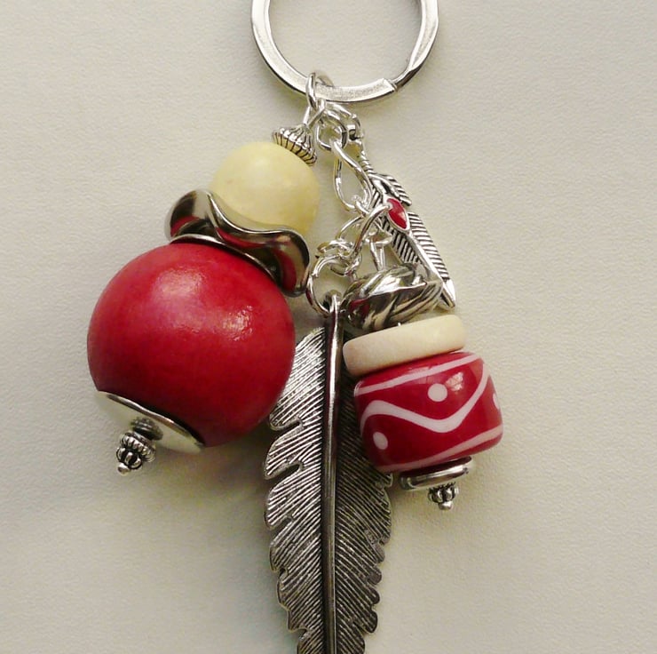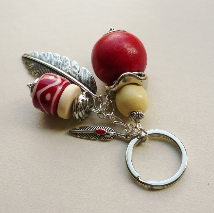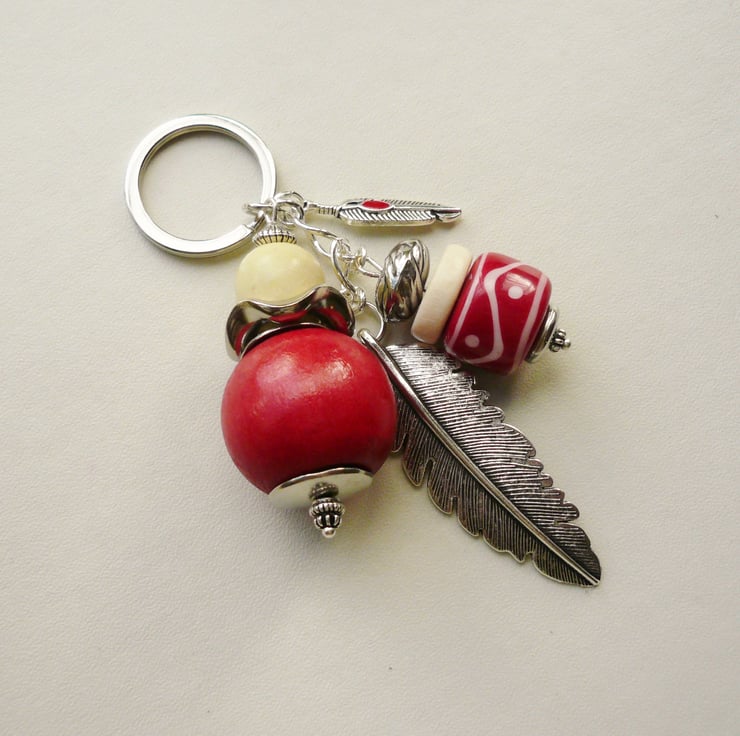 This quite large keyring consists of a 25mm round red wooden bead teamed with a 14mm round cream wooden bead, a 16mm wide red acrylic drum wheel patterned bead, cream pucalet wooden disc and a mix of metalised acrylic spacer beads and Tibetan silver bead caps and spacer beads. Finished off with a 25mm long Tibetan silver feather charm and a larger 5cm long Tibetan silver feather pendant. All attached 25mm split ring and chain. Total length incl ring is approx 11.5cm.