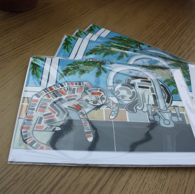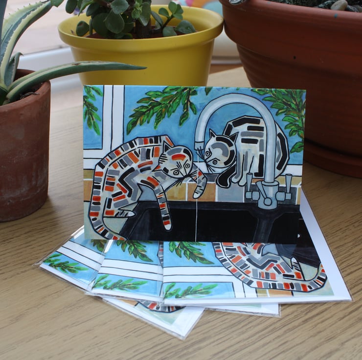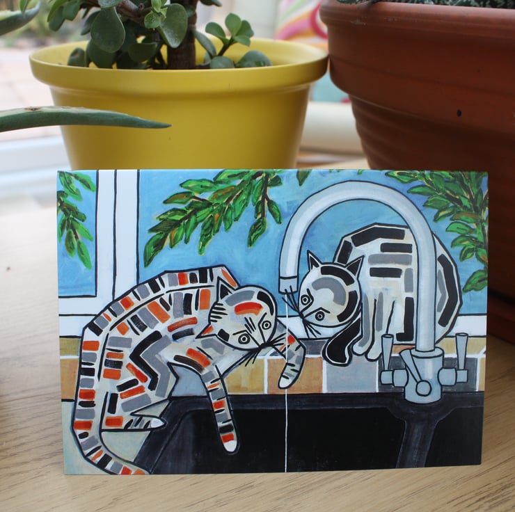 This colourful design is a reproduction of an acrylic painting of my cats. Despite the fact there is always fresh water in their bowl, they would much prefer to drink from the kitchen tap...or even my glass!