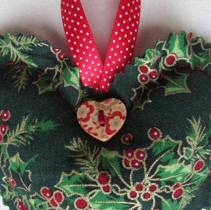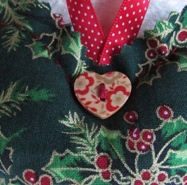 A lovely Christmas decoration hanging heart made from a pretty green fabric with a Christmas holly print pattern in green, red and gold. The heart is hand-stitched and the edges are pinked to give a scalloped edge. It is embellished with a wooden patterned heart-shaped button and has a red hanging ribbon with white polka dots. Size approx. 4.5" (11.5cm) high (excluding ribbon) x 4.5" (11.5cm) wide. The decoration is filled with polyester hollow fibre filling which conforms to safety regulations.