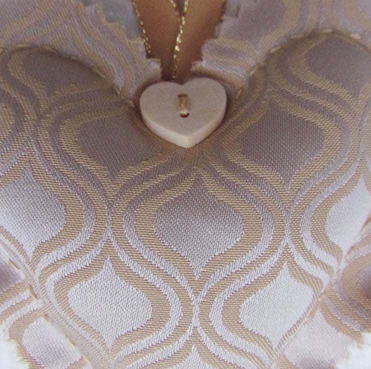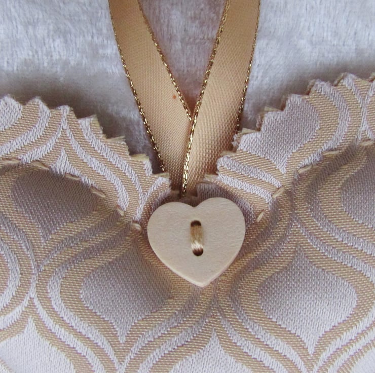 A stylish shabby chic hanging heart decoration made from a lovely satin-finish fabric in shades of gold with an abstract pattern. The heart is padded, hand-stitched and the edges are pinked to give a scalloped edge. It is embellished with a wooden heart-shaped button and has a gold hanging ribbon with sparkle edging.