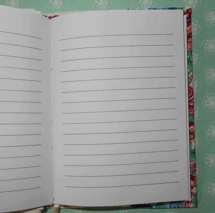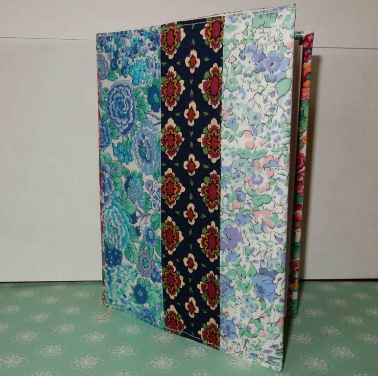 This is a beautiful A6 notebook, with good quality lined paper. This has been covered in a selection of Liberty print cotton fabrics in a patchwork design. It is interfaced and lined in plain fabric, the cover can be removed, and a replacement notebook fitted when needed.