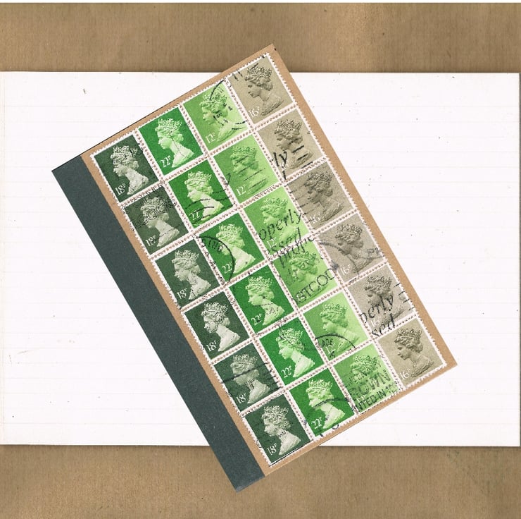 The front cover is covered with a stripy/ombre used postage stamp collage in rich, grass green shades graduating from dark to light. The stamps still bear fragments of postmarks and other cancellation marks as a testament to their former active service with the Royal Mail, making every notebook unique.