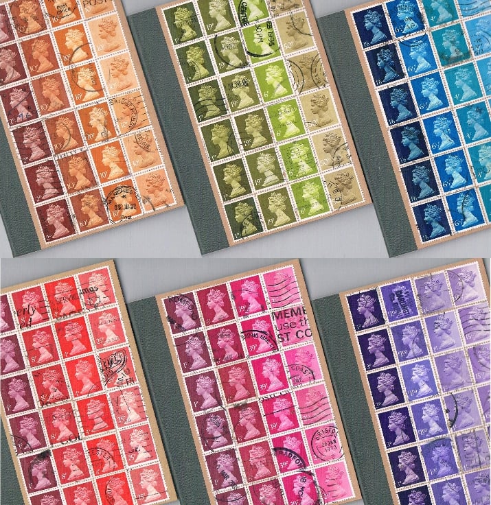 There's something truly fascinating about the way a simple, infinitely repeated design (such as the Machin postage stamp) can also provide infinite variety in the tiny differences acquired during exposure to the world's postal systems. The Machin stamp has been issued in so many colour variations over the decades that this new ombre design seemed an ideal way to show off the colours.