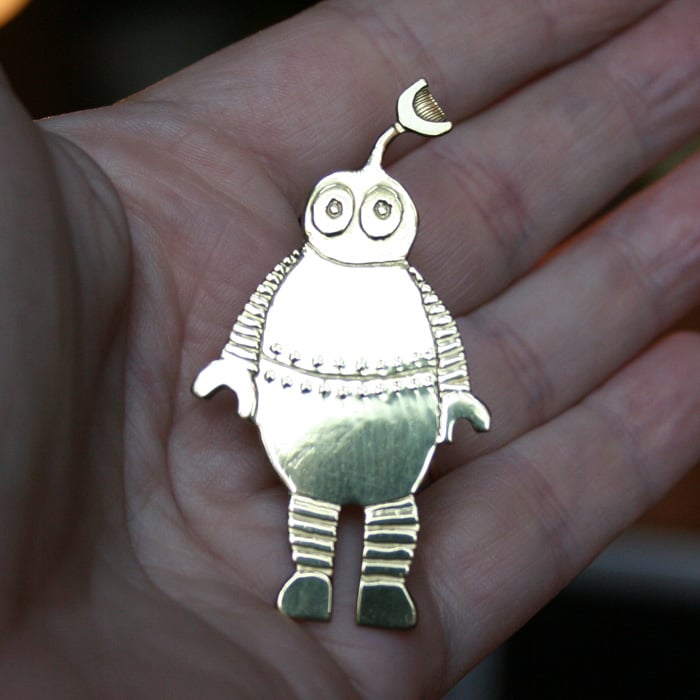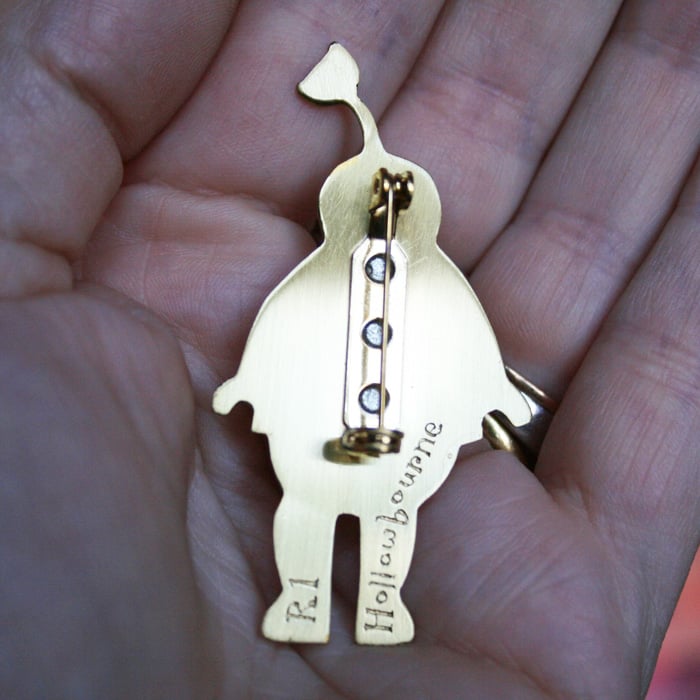 Made from brass, which is a lovely gold colour. This brooch was hand drawn, sawn out then etched and polished. He has a safety catch soldered to the back.