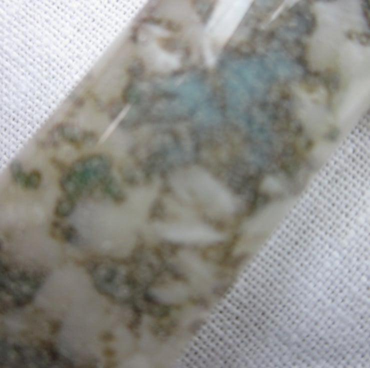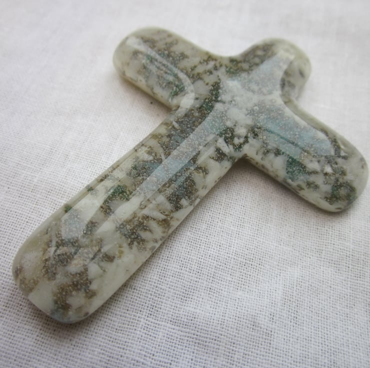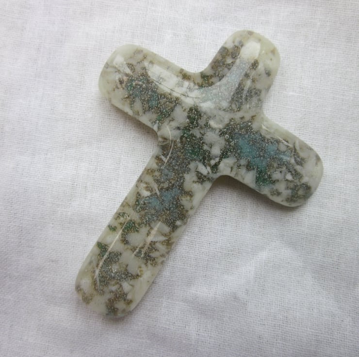 It is a stunning cross, with blue and jade frit cast within an vanilla base and encased in clear glass. My favourite combination of glass! The copper within the blue and green react with the sulphur in the vanilla glass making a truly unique reaction, like marble veining.