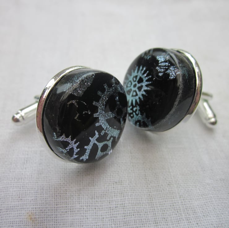 These round cufflinks have a beautiful silver dichroic steam punk design of cogs on a black glass base. They are fitted within silver metal cabochon cufflinks. They are approximately 18mm wide.