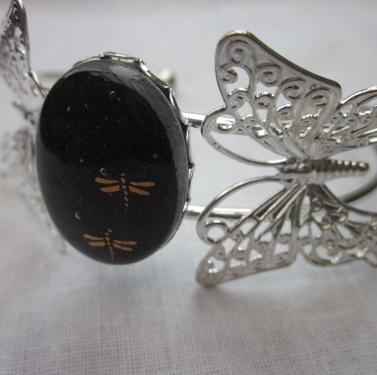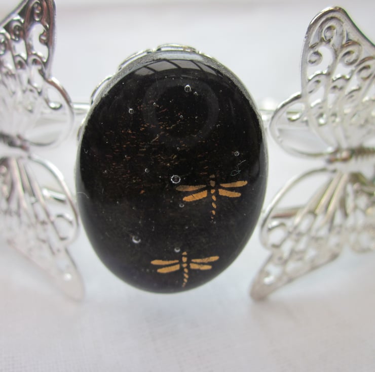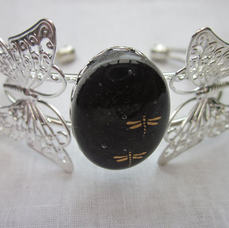 This cabochon is a beautiful dichroic shimmer in chestnut brown with a dark purple base, creating a deep shimmer. The beautiful dark dichroic is very difficult to photograph! On the surface are 22 carat gold dragonflies. Please note that this is not a sticker but a real gold glass decal. This is set within a cabochon setting on a silver plated open bangle with filigree butterflies which has a circumference of approximately 7 inches. Perfect for special occasion wear.