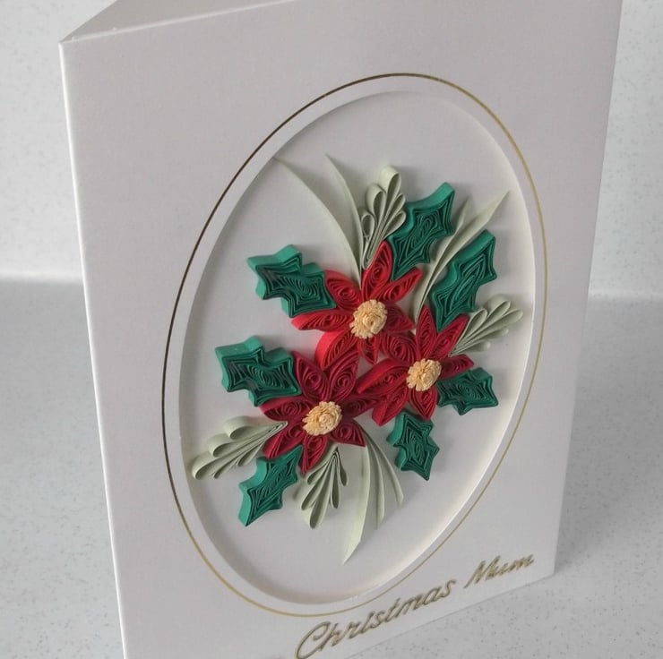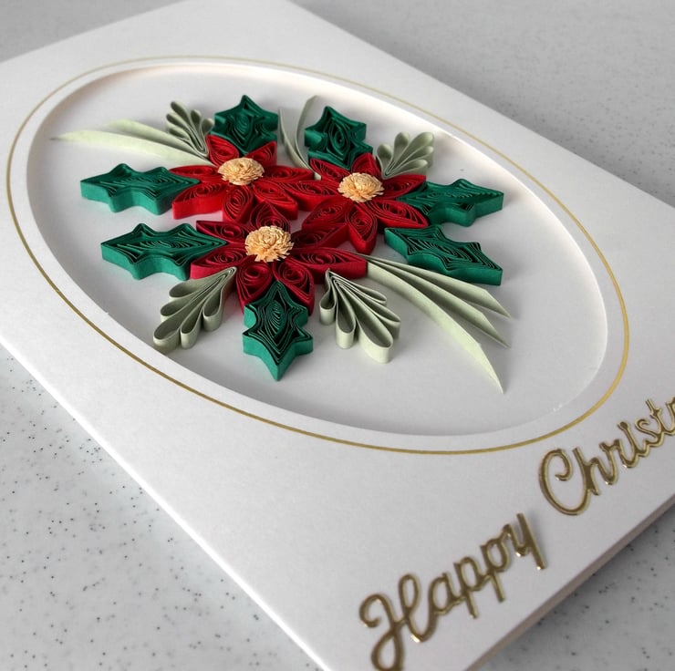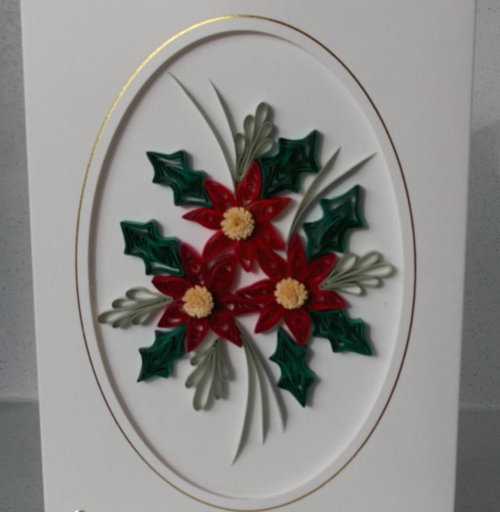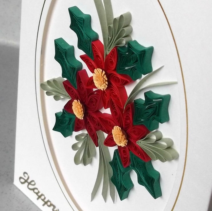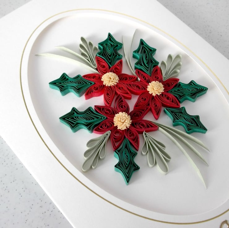 A quilled Christmas card with poinsettias and holly in festive colours.