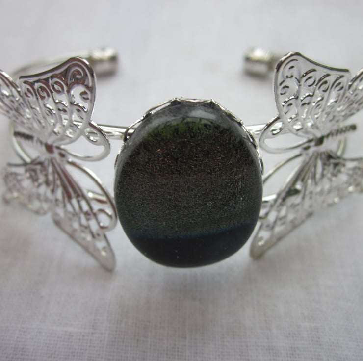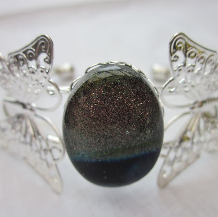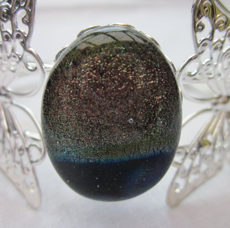 This cabochon has a pretty gentle rainbow dichroic shimmer on a black base. The colours are an amazing mix of royal blue, teal, turquoise, gold-green and silvery pink. This is set within a cabochon setting on a silver plated open bangle with filigree butterflies which has a circumference of approximately 7 inches. Perfect for special occasion wear.