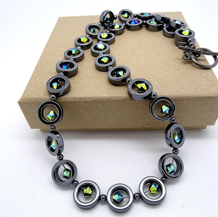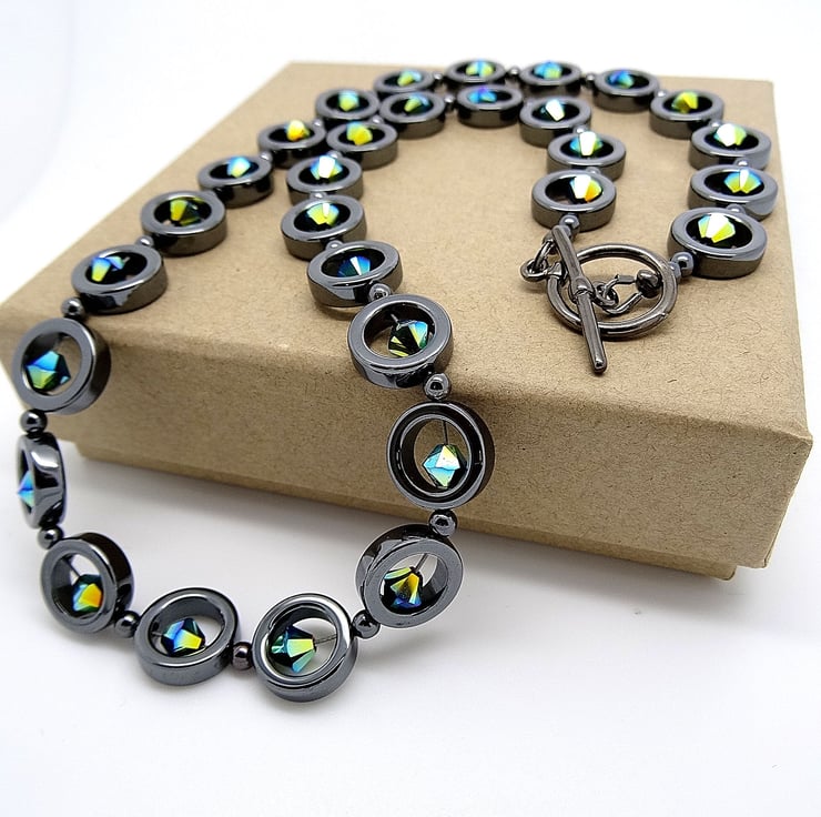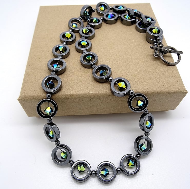 This is a lovely necklace made with Hematite open circles in which I have added boreolis swarovski crystals which shine teal and gold colours. The Hematite circles each measure 1cm in diameter and the swarovski crystals each measure 5mm. These are interspersed with gunmetal coloured spacer beads and the necklace closes with a gunmetal coloured toggle clasp. The measurement is 48cm (19"). As all of the items in my shop are unique, individual pieces made by myself, this is the necklace you will receive. It will arrive gift wrapped in tissue paper and a organza bag.