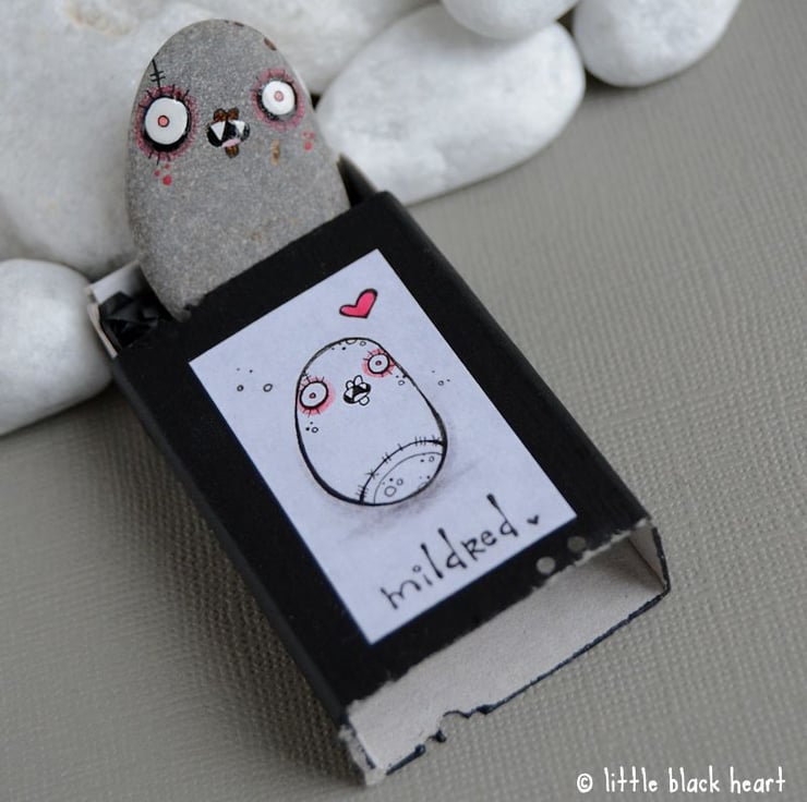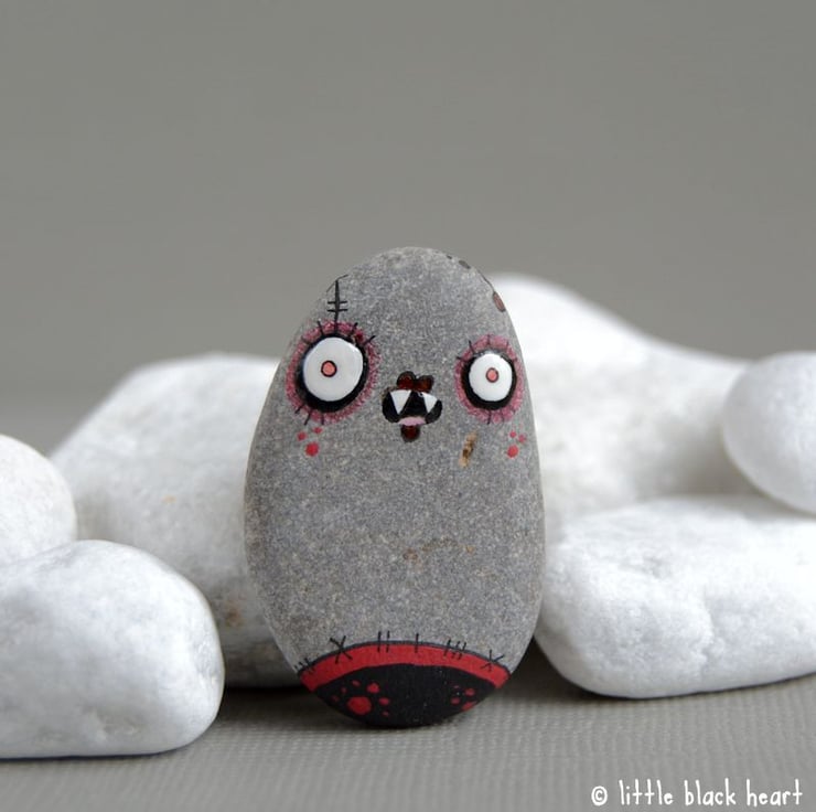 this is mildred. she used to be a regular rock, then she was a zombie rock. then she got bitten by a vampire, so now she is an evil vampire zombie rock! poor gal. it's all gone wrong for her :(