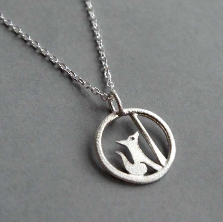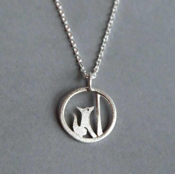 A cute necklace featuring a tiny tree and fox set within a hand forged irregular circle for an organic feel, and hung from an 18 inch sterling silver chain. The finish is a lovely frosted texture which has a subtle sparkle and is slightly rough to the touch. Please note each one may vary slightly as they are completely drawn/cut/soldered by hand.