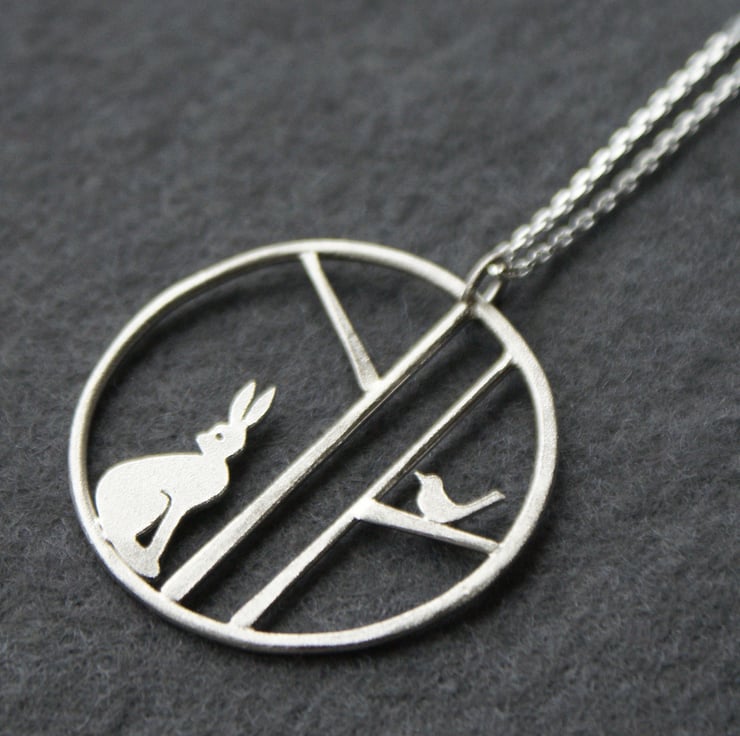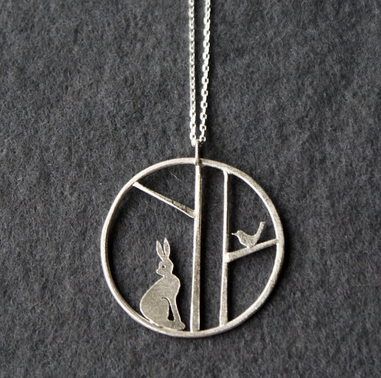 A stunning necklace featuring a little line of stylized trees with a bird perched on one side and a hare underneath. Soldered within a hand forged irregular circle for an organic feel and hung from an 18 inch sterling silver chain. The finish is a lovely frosted texture which has a subtle sparkle and is slightly rough to the touch. Please note each necklace may vary slightly as they are completely hand made from scratch each time.