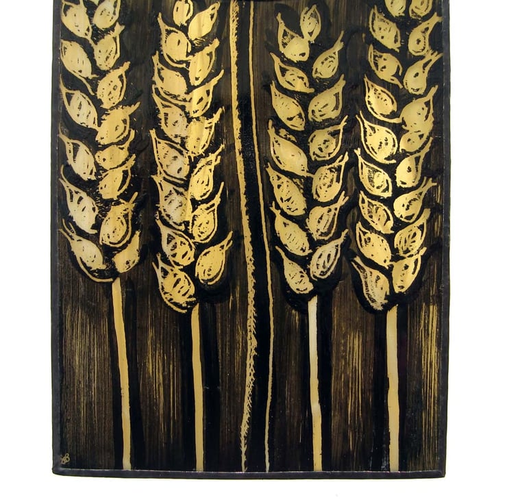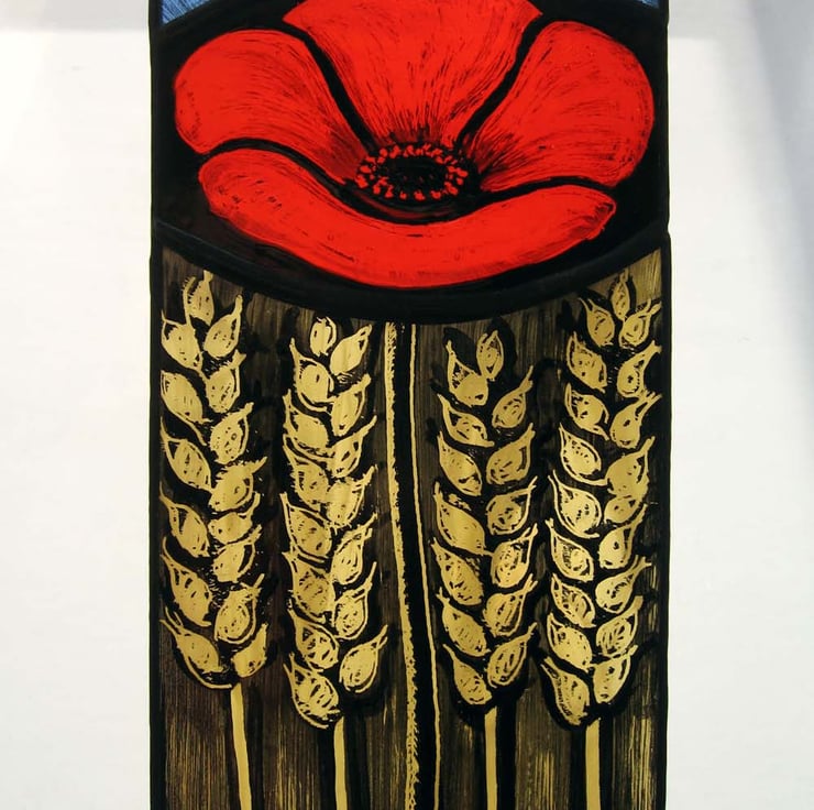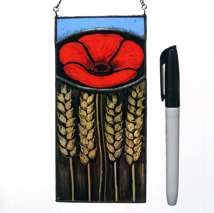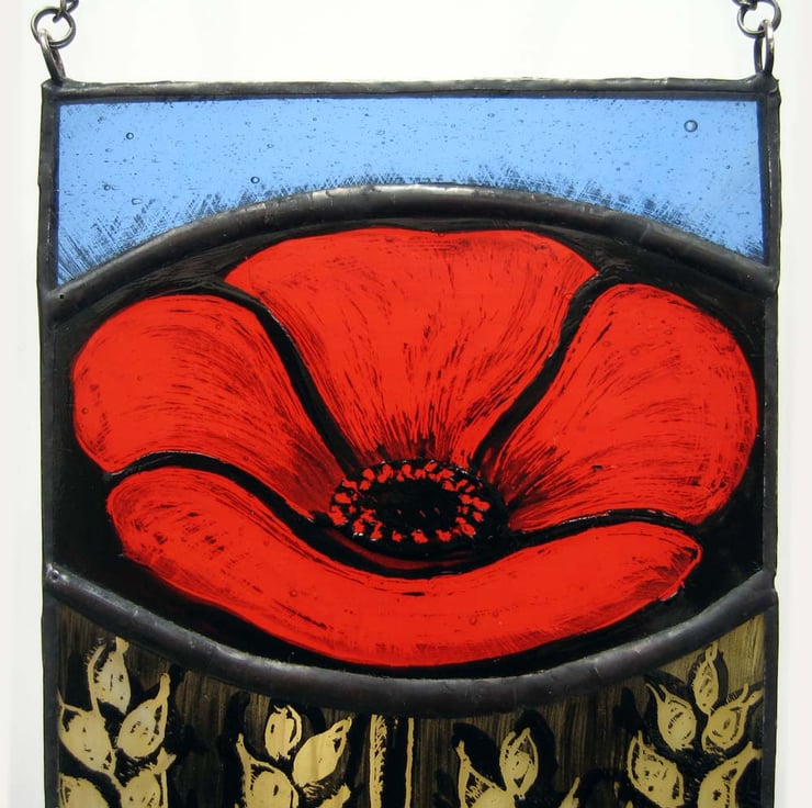 Created using traditional stained glass techniques and materials this panel has been hand painted onto antique style, red and straw coloured glass and fired in a kiln. The tracing paint fuses together with the glass making the image permanent and enduring.