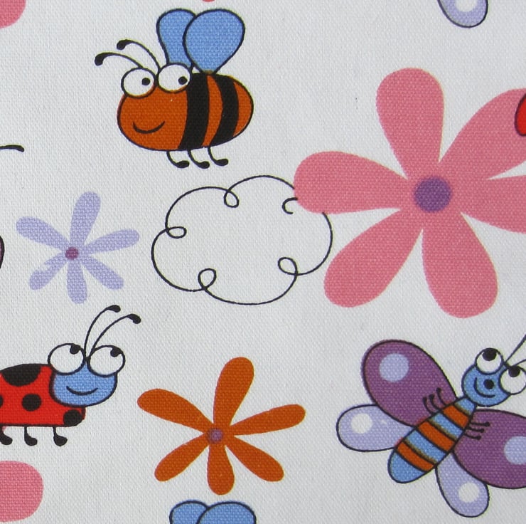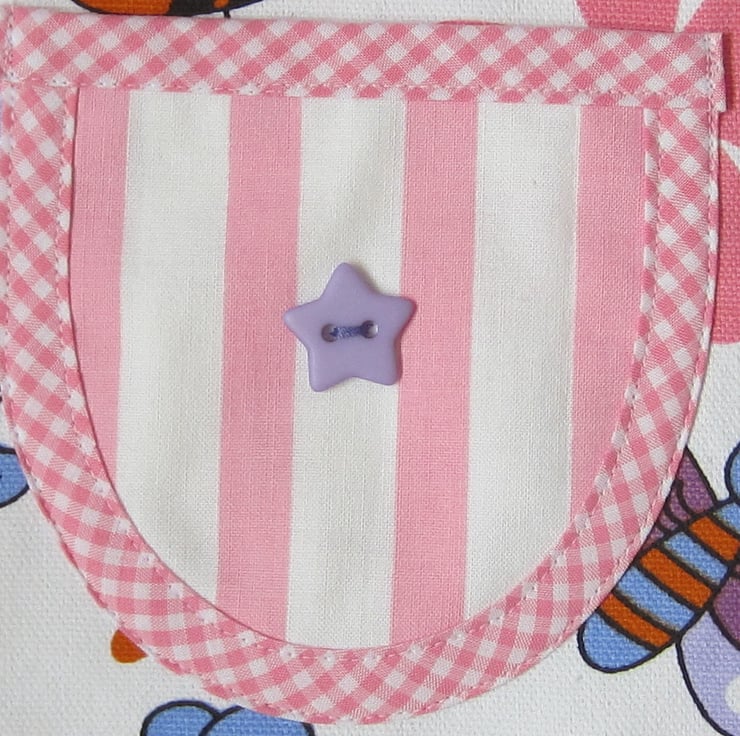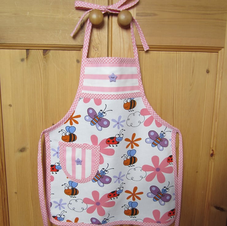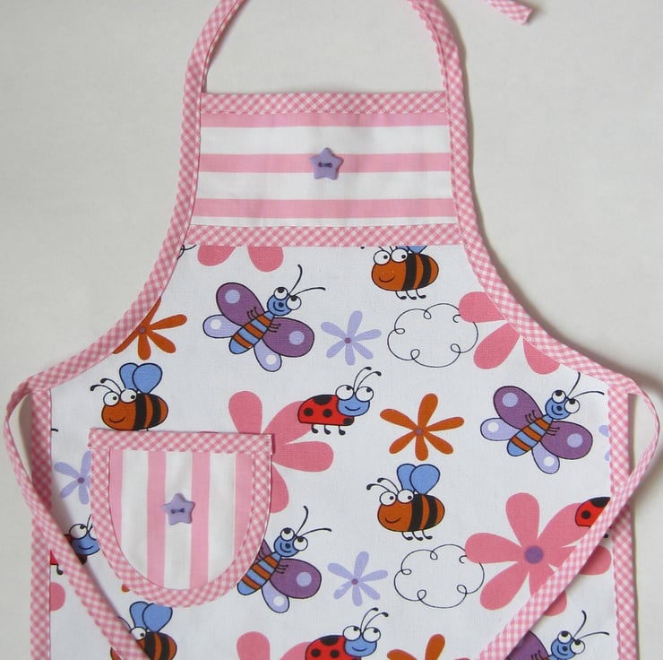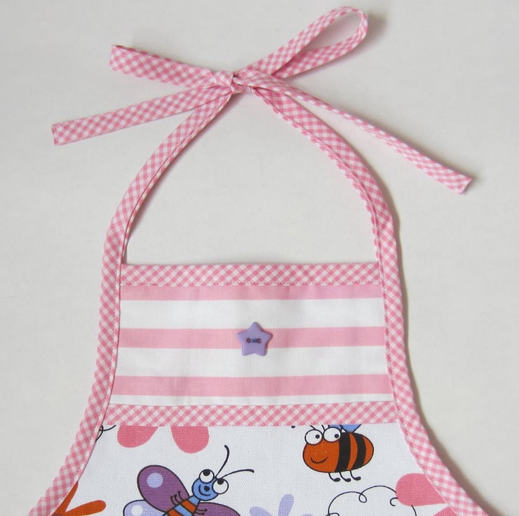 Pretty pink and lilac apron featuring butterflies, bees and ladybirds with pink striped pocket and top panel and pink gingham edging and straps. Lilac star buttons have been added for extra decoration. Suitable for a child aged about 2 to 4 years old. It measures 38 cm wide and 46 cm long. Fastens with a bow at waist and neck.