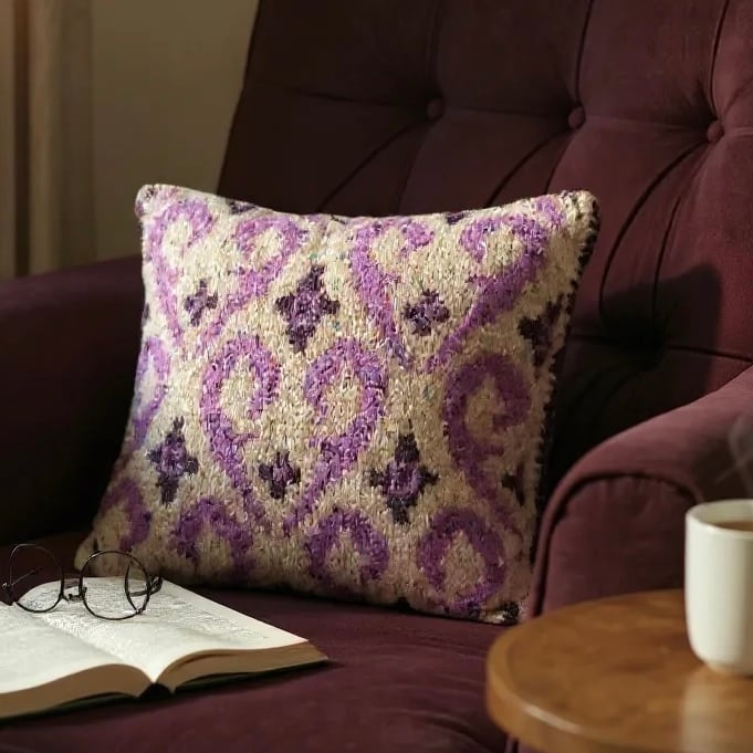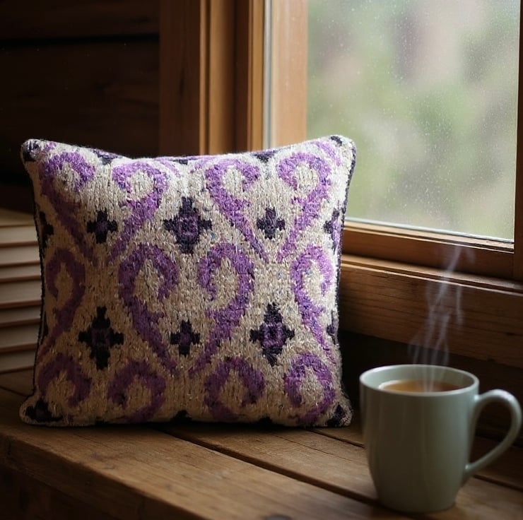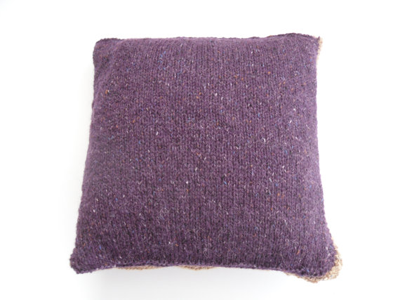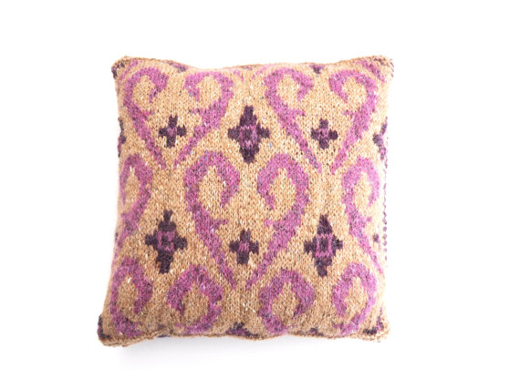 This small cushion / throw pillow has been hand knit using one of my new fair isle design patterns. Knit in 100% felted tweed yarn in a gorgeous tan colour with feminine pink swirls and purple accents. The back of the cushion has been knitted plain in the purple.