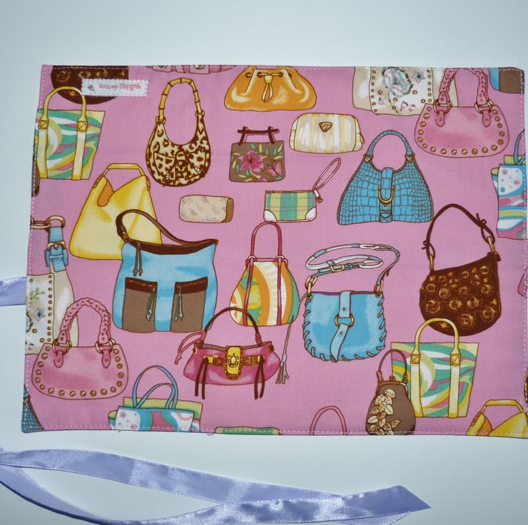 I have used a 100% cotton fabric to create this fantastic crochet hook case. It is sewn from a handbags on pink background print fabric with a co-ordinated cotton lining and has a ribbon tie.