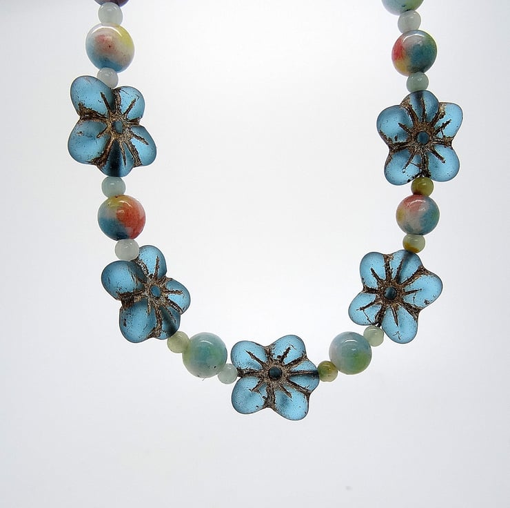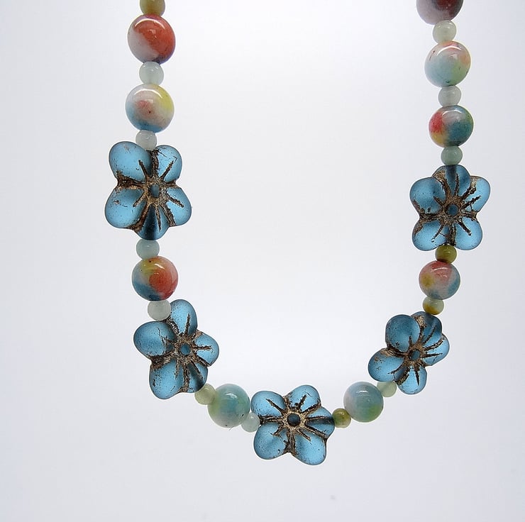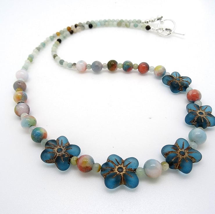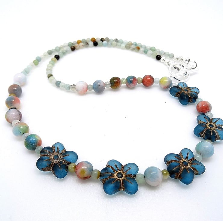 This is a lovely necklace made with Czech Glass puffed daisies which measure 14mm x 12mm each, 6mm Jade Beads and 3mm Amazonite beads. The colours of the daisies are a beautiful blue with a gold etch running through them. The necklace measures 45mm (17.1/2") and closes with a silver plated toggle clasp. As all of the items in my shop are unique, individual pieces made by myself, this is the necklace you will receive. It will arrive gift wrapped in tissue paper and a organza bag.