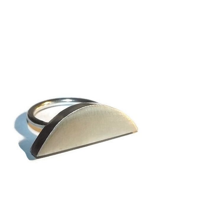 A sleek modern silver ring featuring a semi circle hollow form which has been handmade from sheet silver.