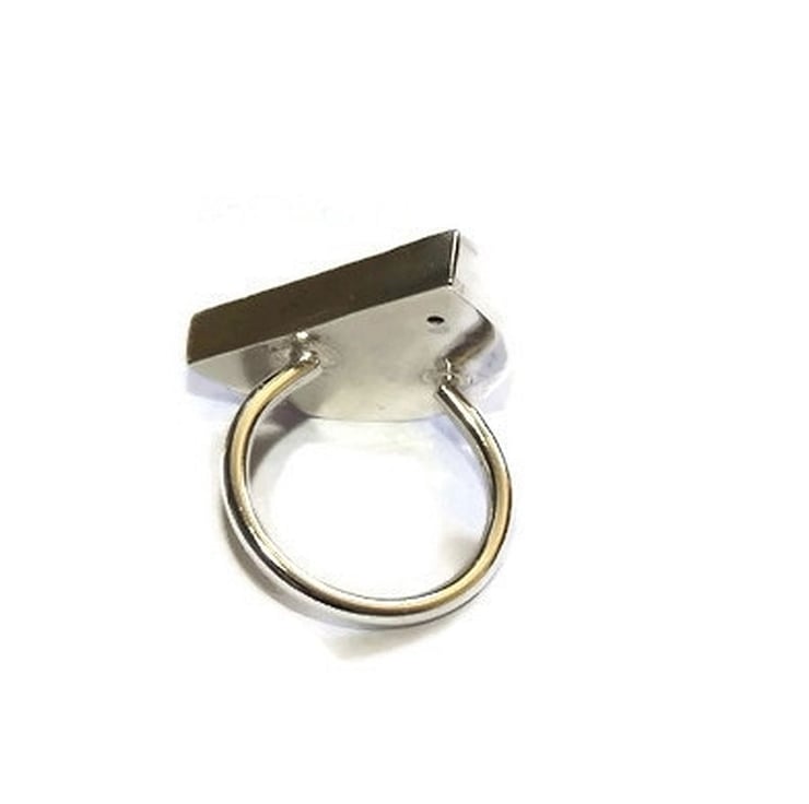 The semi circle measures 2.3cm long, 15mm wide and is 4mm thick. It sits on a 2mm thick round sterling silver wire ring shank which can be made to any size required