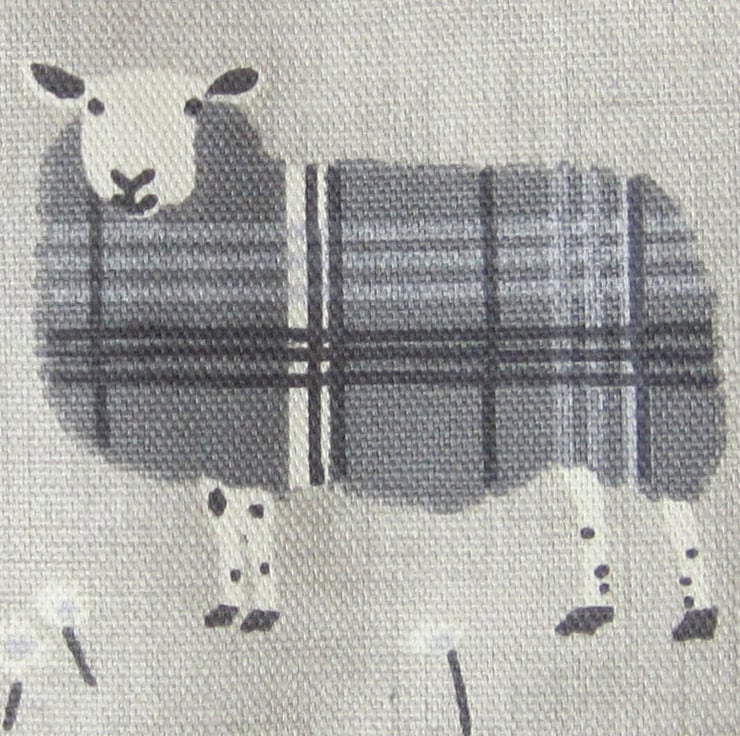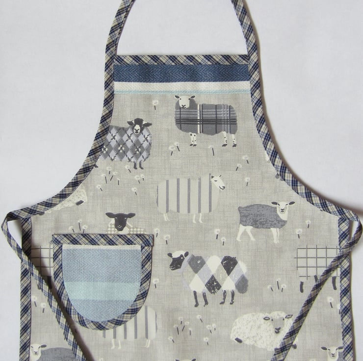 Sheep apron in blues and greys with a blue striped pocket and top panel. Edged in blue check bias binding. Suitable for a boy or girl aged about 2 to 4 years old. It measures 38 cm wide and 46.5 cm long. Fastens with a bow at waist and neck.