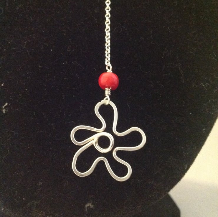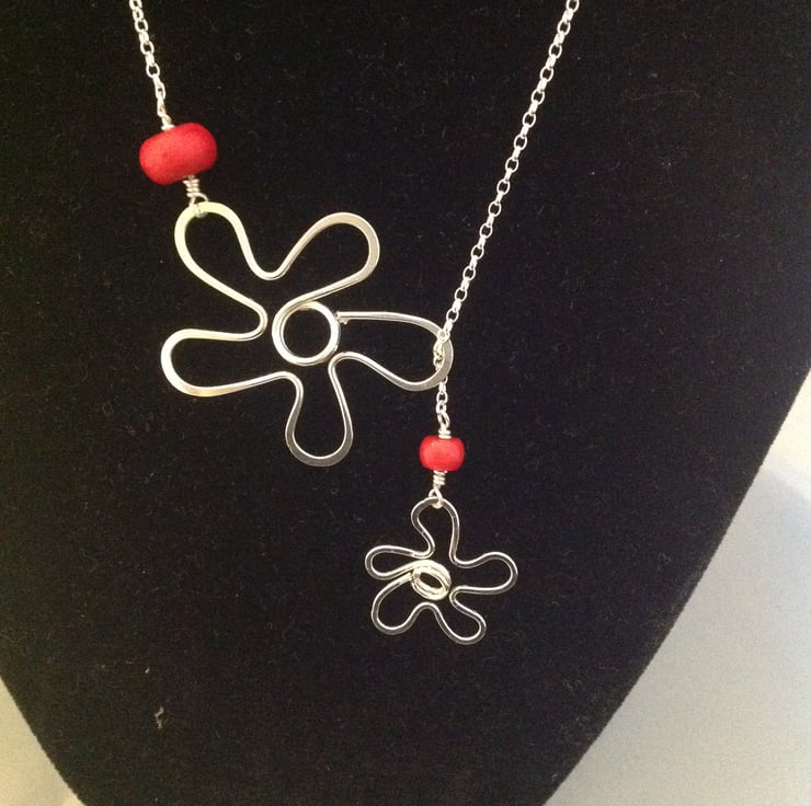 Sterling silver flowers with silver chain and red coral beads make this unusual and fun necklace.