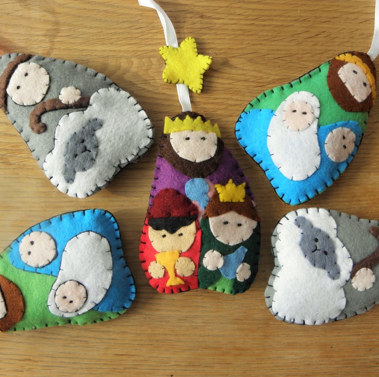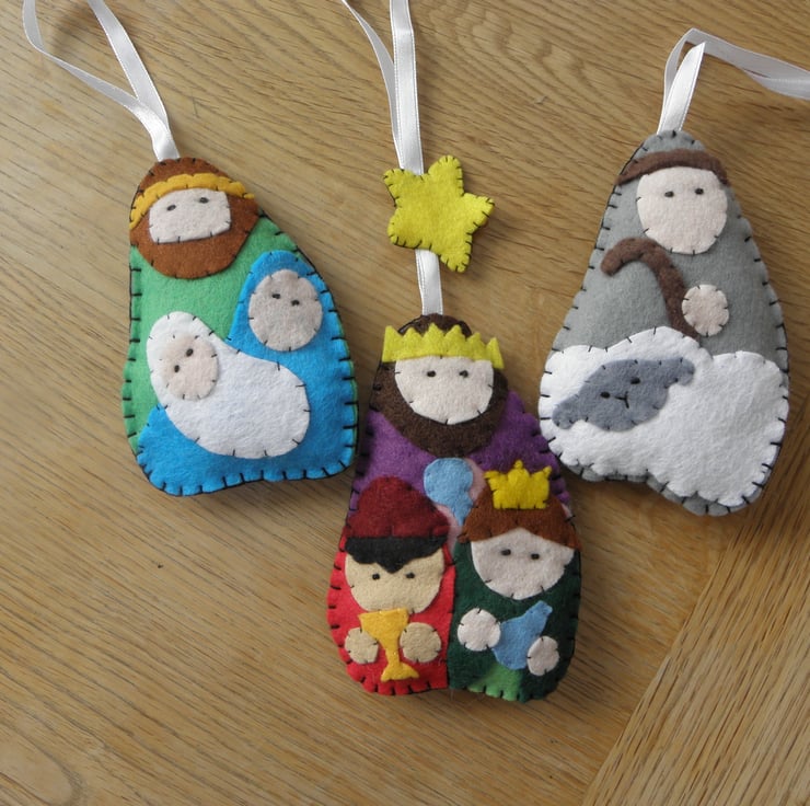 This adorable set of 3 colourful, soft padded felt hanging decorations captures the essence of Christmas and makes a lovely addition to any Christmas tree. The set consists of 3 pieces depicting Jesus, Mary & Joseph, a shepherd and sheep plus the 3 wise men.