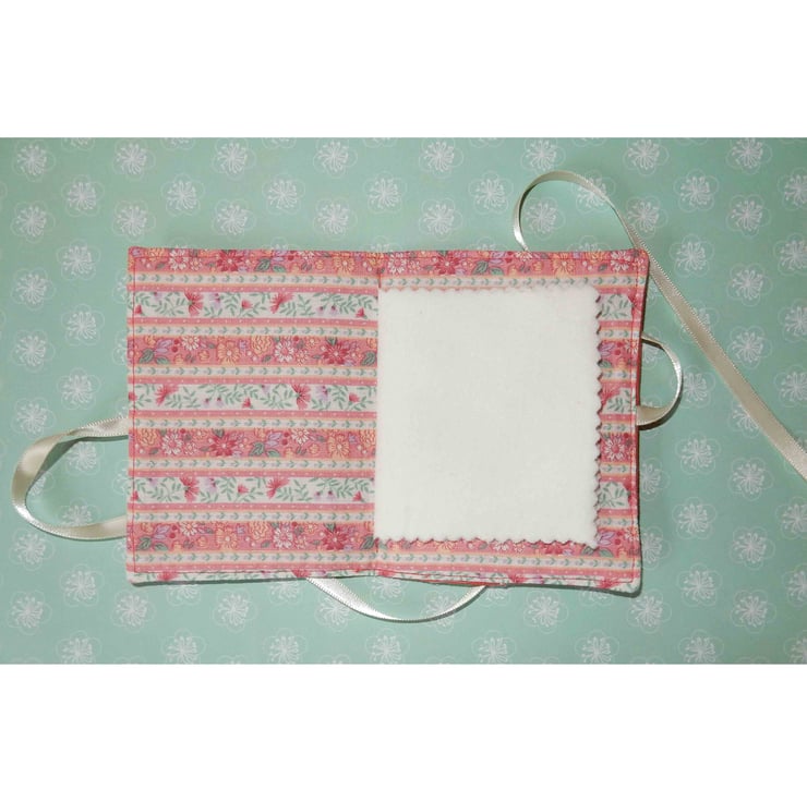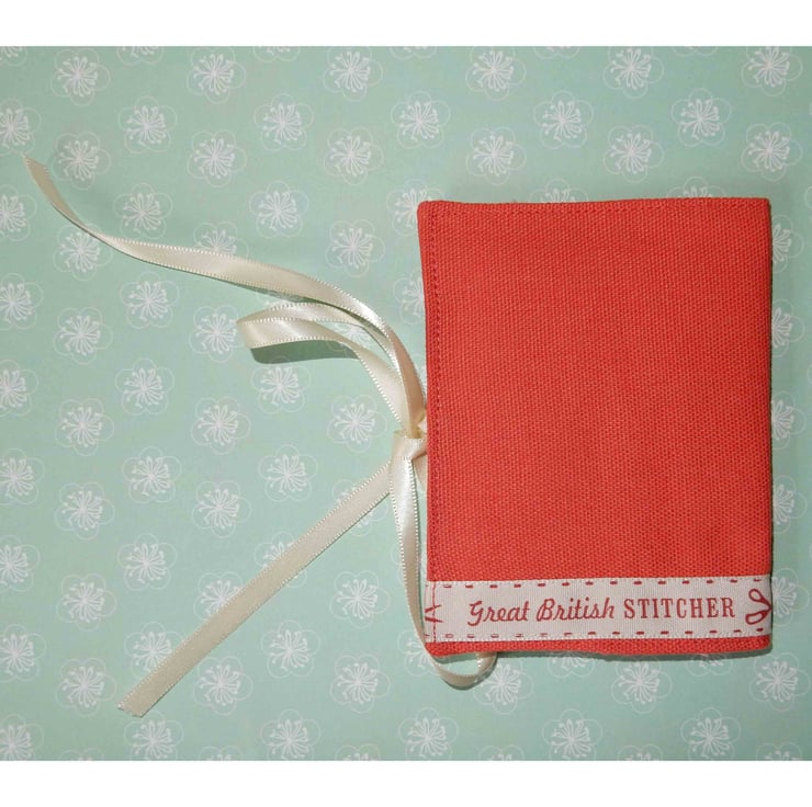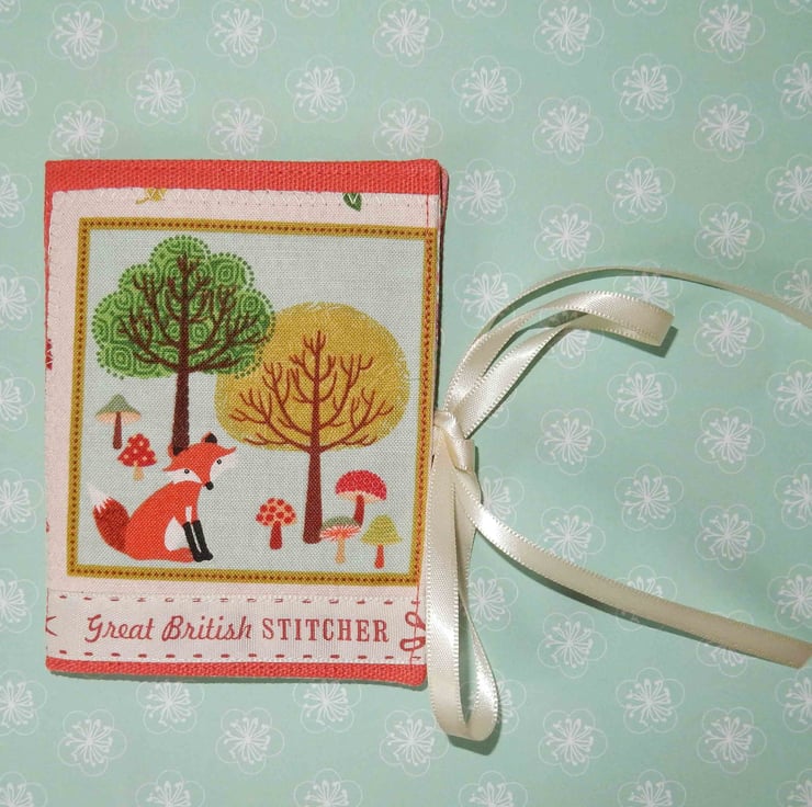 This pretty needlecase measures approx 4.5 x 3 inches and is made from a plain brick red woven fabric, with an appliqued fox panel, with a ribbon reading "Great British Stitcher".It is lined in toning cotton fabric and has four flannel leaves for your pins and needles. It is fastened with ribbon ties, which can be tied right round the case for protection in a bag.