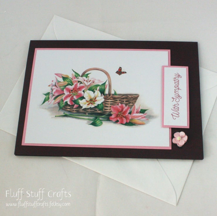 A6 burgundy card featuring an image of a basket of lillies layered onto pretty pink card. The colours were chosen to hopefully make the card feel brighter and more uplifting than some sympathy cards. The sentiment reads: 'With Sympathy' and the card is embellished with a small pink flower.