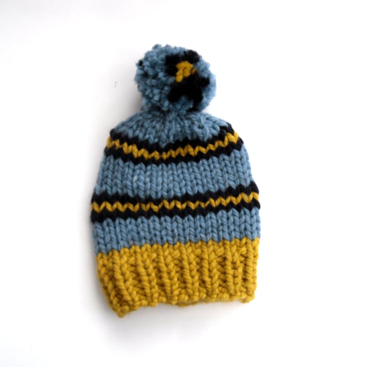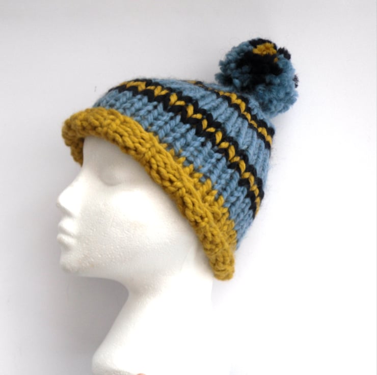 Hand knit thick and chunky striped beanie hat. Great for this coming winter. Will keep your head and ears super warm. Big 3.5" pom pom sits on the top of the hat.