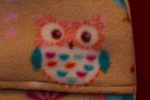 A beige fleece fabric covered in foxes, owls and hedgehogs. The hot water bottle slips neatly inside the cover and keeps you nice and warn through the cold winter evenings.