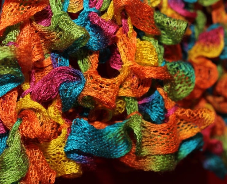 A hand knitted scarf in a decorative lacy effect light wool. This is a beautifully soft scarf suitable for any occasion, indoors or out. The scarf measures over 1.5 meters in length and between 15 to 20cm in width in an amazing array of bright colours.
