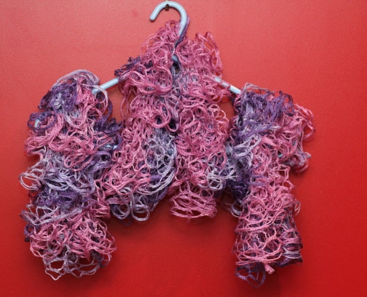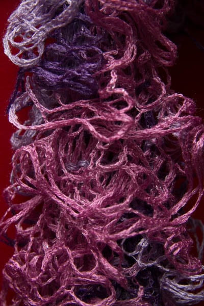A hand knitted scarf in a decorative lacy effect light wool. This is a beautifully soft scarf suitable for any occasion, indoors or out. The scarf measures over 1.5 meters in length and between 15 to 20cm in width and is in a combination of lilac and pink tones.