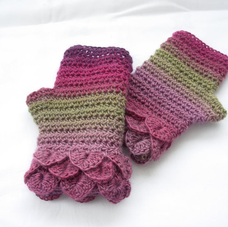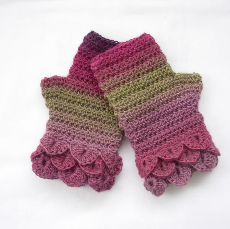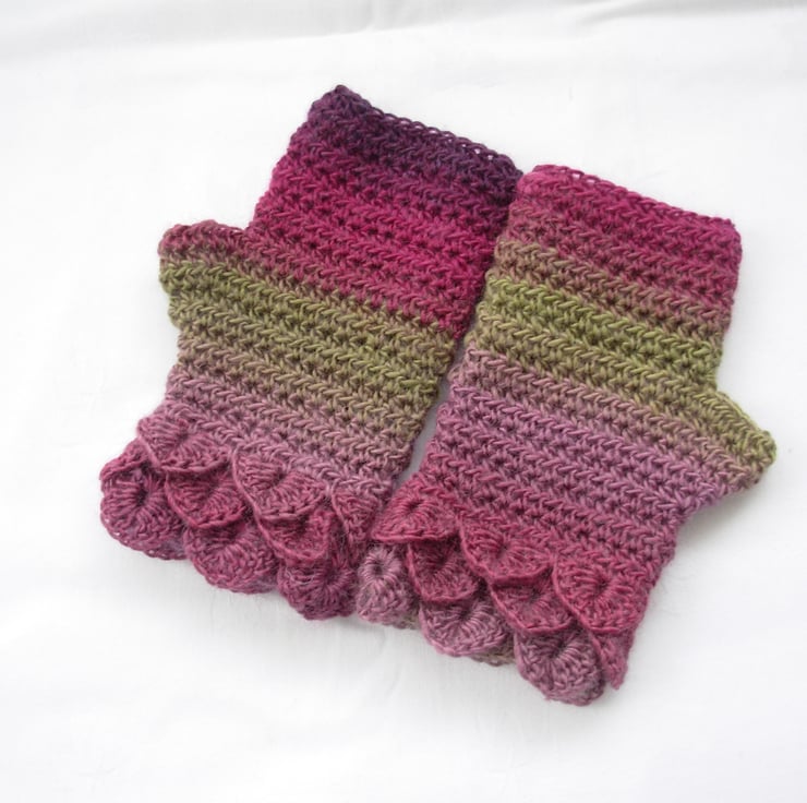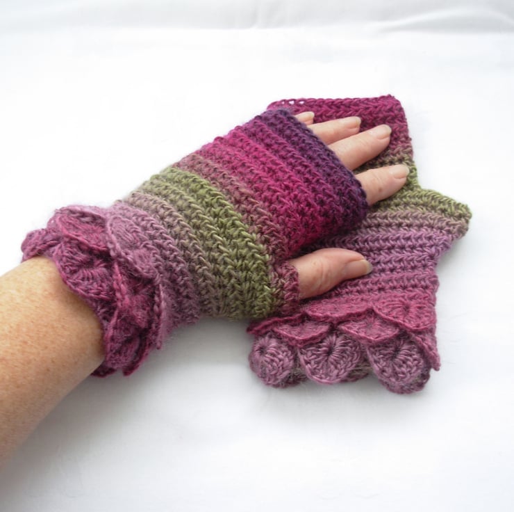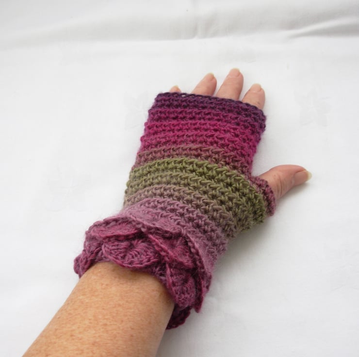 These fun and cosy adults fingerless mitts cum wrist warmers are crocheted in a soft wool and acrylic double knit yarn in graduated purple, pink and moss green. They have three layer crocodile stitch cuffs and plain body.
