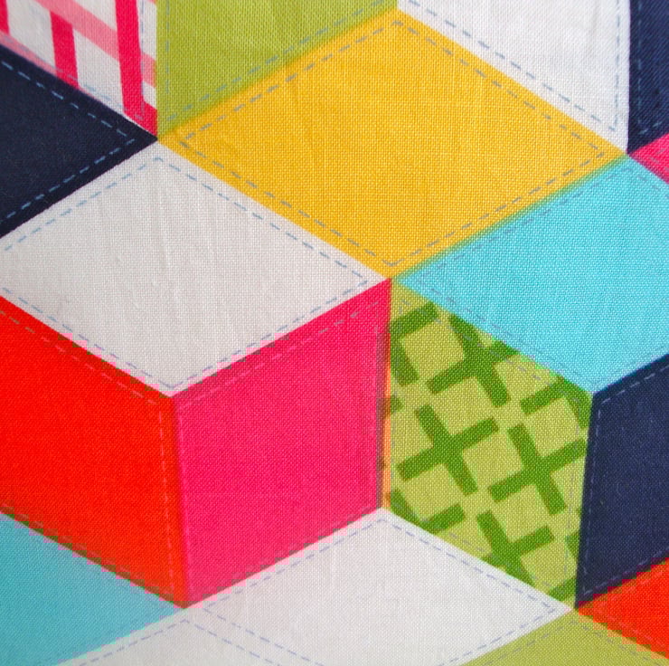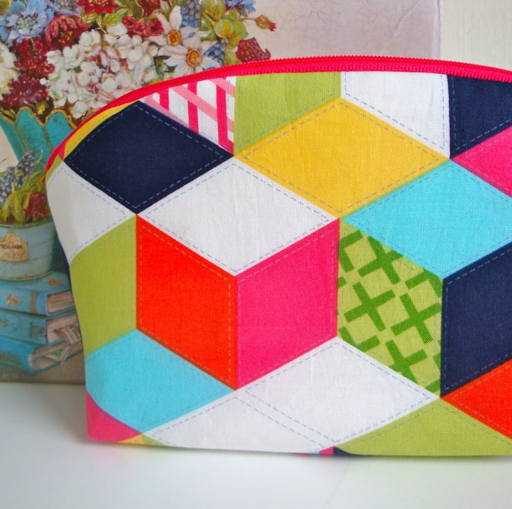 Bag has been made in a lovely geometric cotton fabric ( interfaced ) , and closure is a raspberry pink zip across top .