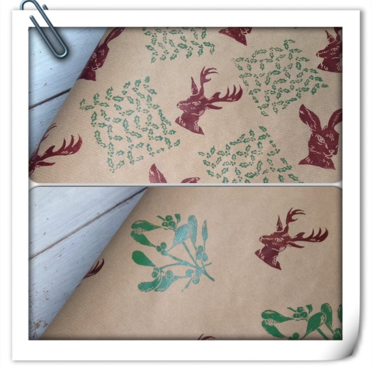 A beautiful gift wrap featuring a mistletoe and Stag combo design in Venetian Red and a lovely green ink on kraft paper. Hand printed in a random pattern, on a 50 cm x 70 cm sheet.